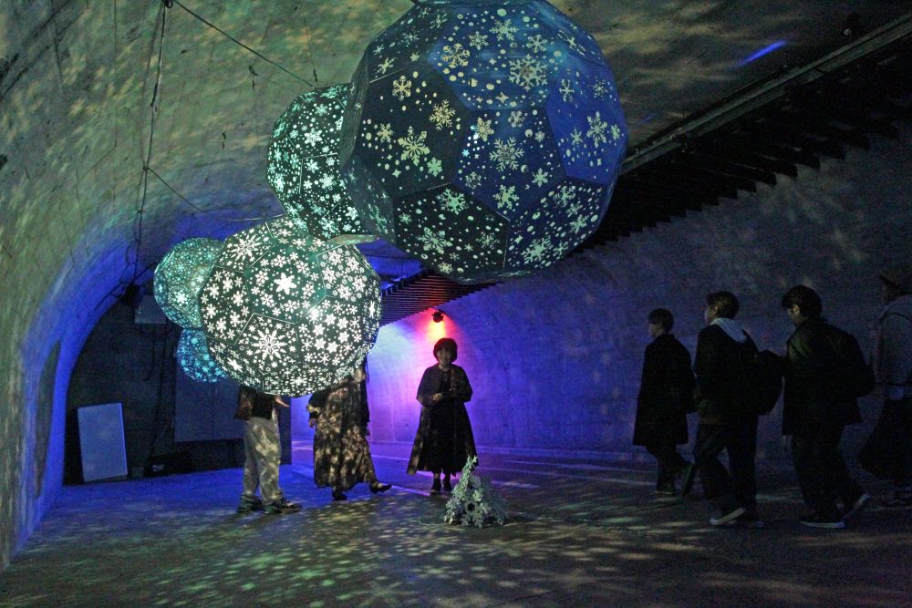 紅葉と一緒に楽しみたいのが、滝とトンネル内をライトアップする恒例の催し「大子来人(ライト)」。滝のライトアップは日没から。夜の闇に滝が白く浮かび上がる。トンネル内は、日中もライトアップされている。装飾の今年のテーマは「秋冬クリスマス」。秋の紅葉や冬の雪、氷をモチーフにした演出だ=下写真。