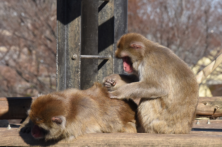 確かに、ニホンザル舎を見わたせば、サル団子ができている一方で、タワーの最上段で寒風にさらされているサルがいたり、のんびり毛繕いを繰り返すカップルらしき2匹がいたりする。